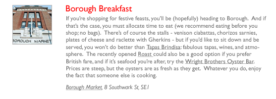 Borough Market Brindisa Wright Brothers Roast CVO Shochu Loungelover Loungelover Annex 3 Les Trois Garcons China Tang Hinds Head Hotel The Fat Duck The Fat Duck Sketch The Ivy Le Caprice Chez Bruce Nobu Cipriani Manhattan User Guide Chocolate and Zucchini Yuletide Events