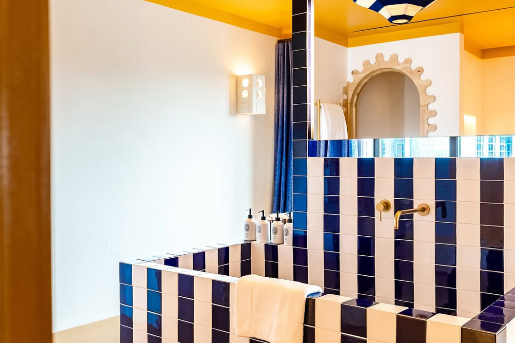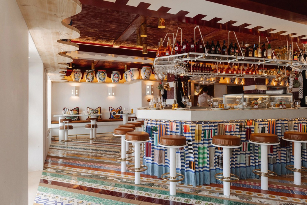 The group are known for their bespoke designs in every venue they own, and here they inject a bit of playfulness into the space. The lounge has modular blue printed sofas and a shag rug. The pillars are painted with black and white stripes, and there are accents of orange and yellow. There’s an uplifting vibe throughout.